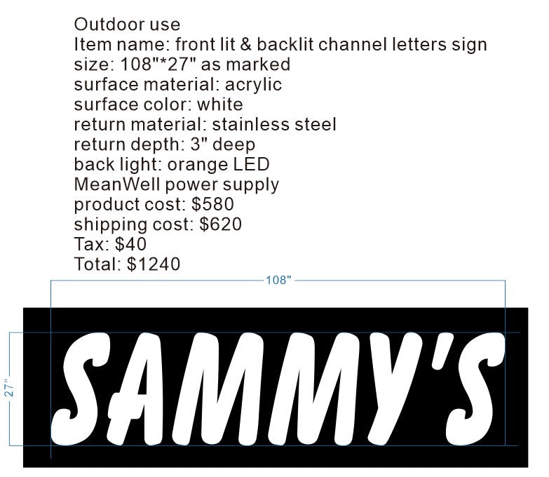 1.white painted stainless steel letters shell 2.6500K back light 3.return depth: 1.5 inches 4.backboard acrylic:...