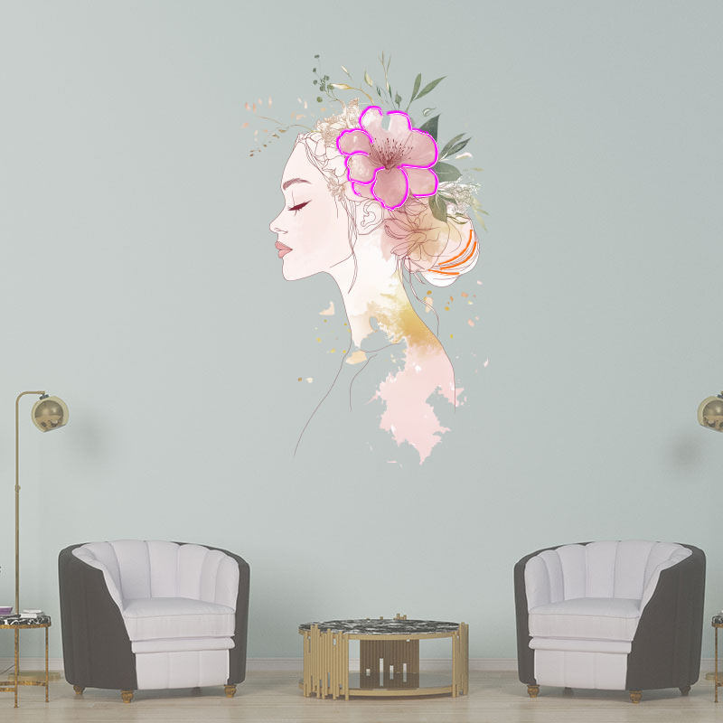 Beautiful Girl Profile LED Neon Sign in Square Frame - Floral Hair Decoration - Perfect for Home Decor & Unique Gifts