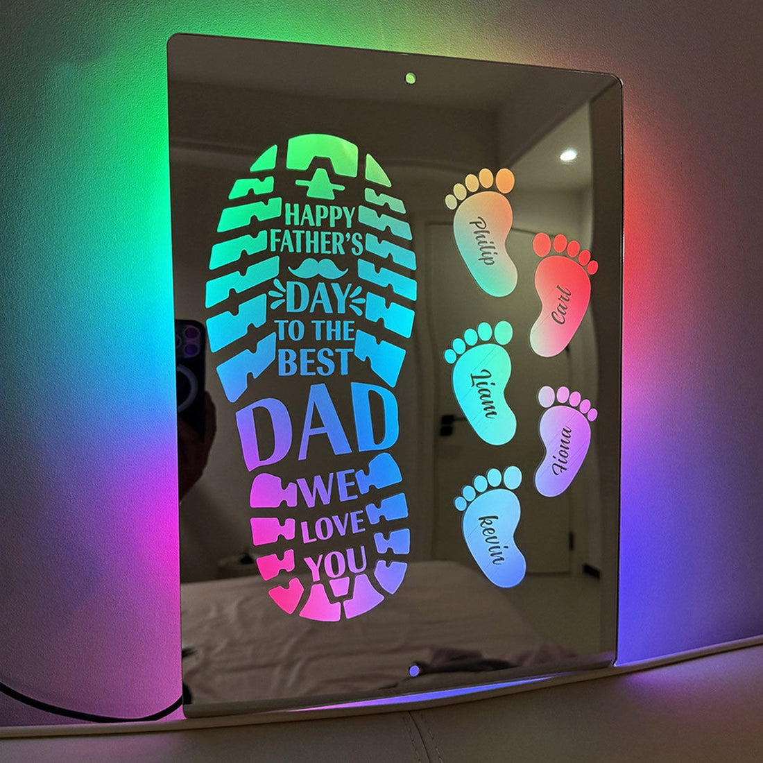 Personalized Name LED Mirror Sign with Feet - Happy Father's Day Mirror - Custom Illuminated Name Mirror Sign - Cool Bedroom Decoration for Father's Day - Best Gifts to Dad