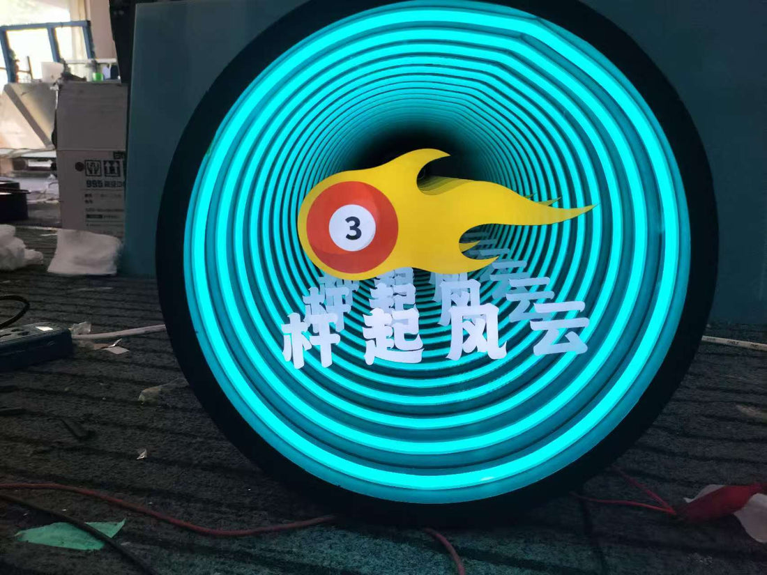 Round LED Infinity Mirror Wall Art – Billiards 3 Ball with Flame Neon Sign, Blue Tunnel Optical Illusion Pool Room Decor