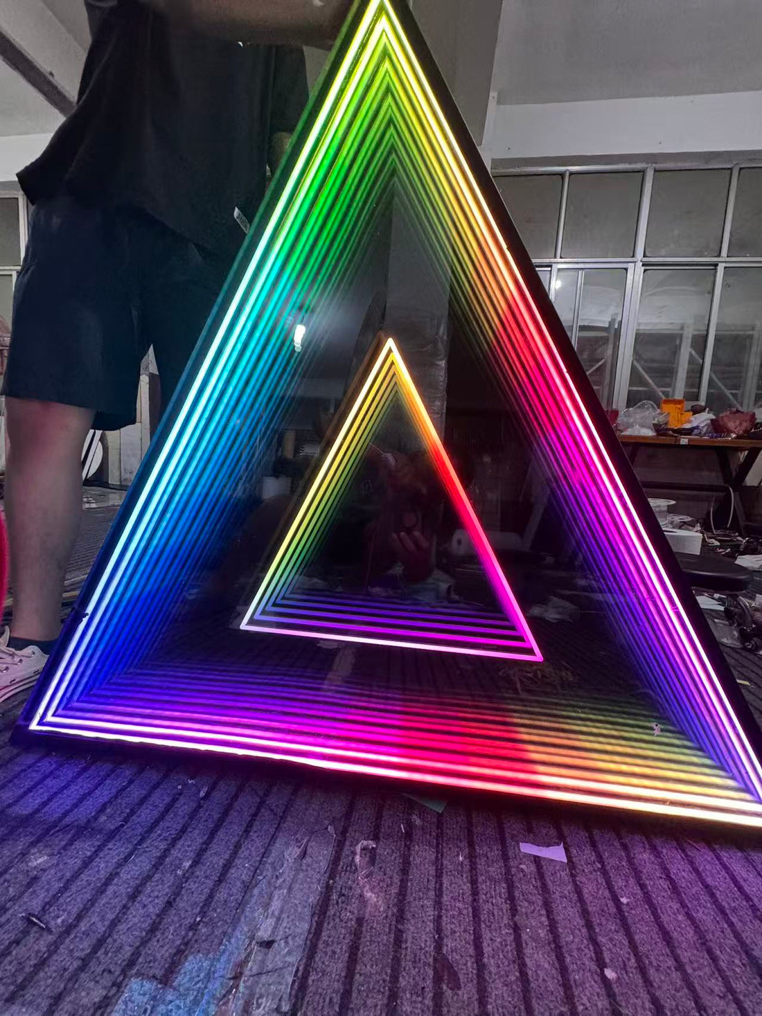 Rainbow Triangle Infinity Mirror Wall Art – LED Geometric Illusion Light, Colorful 3D Neon Decor for Modern Home & Gaming Room