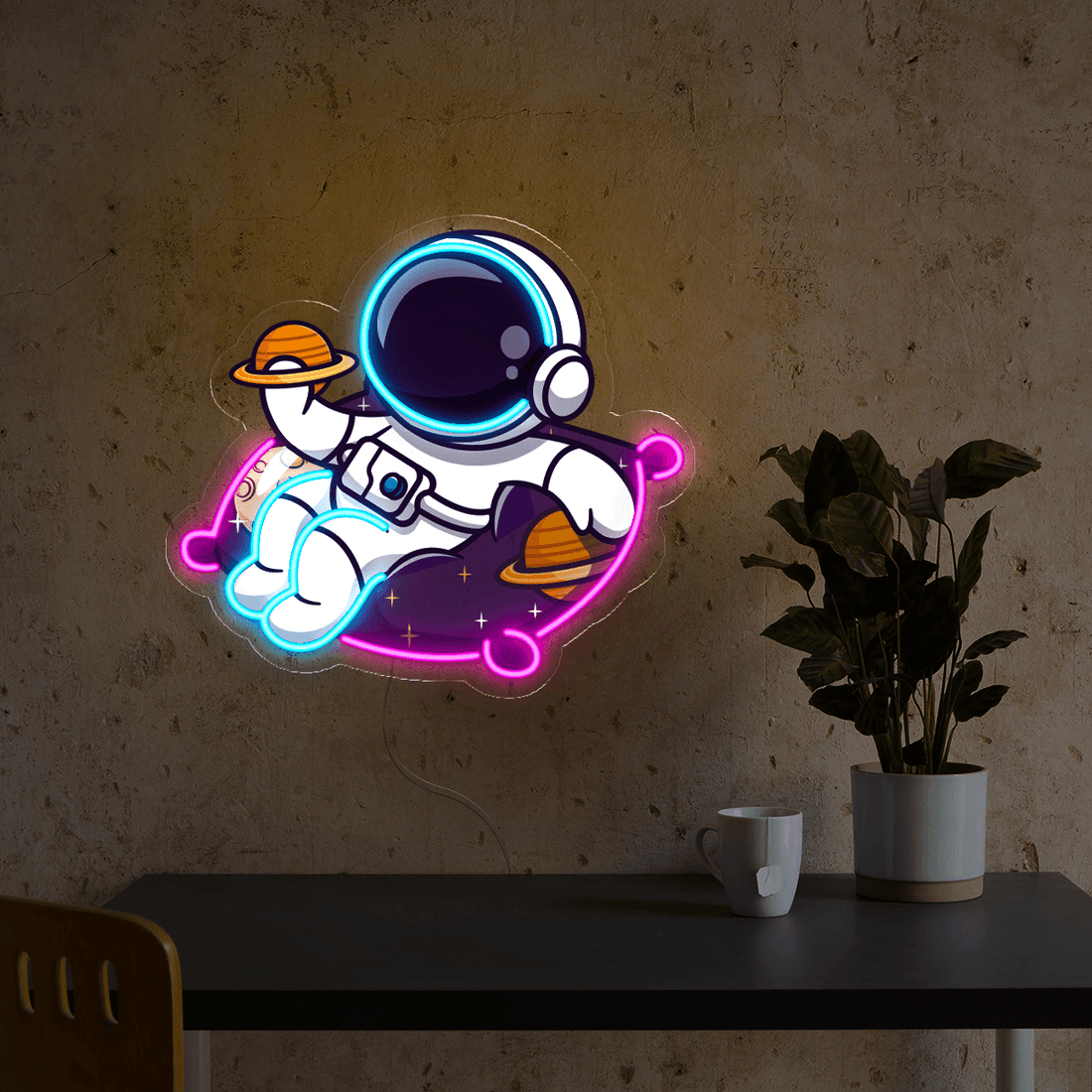 Cute Astronaut Holding Planet Artwork Led Neon Sign