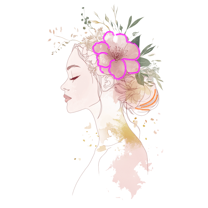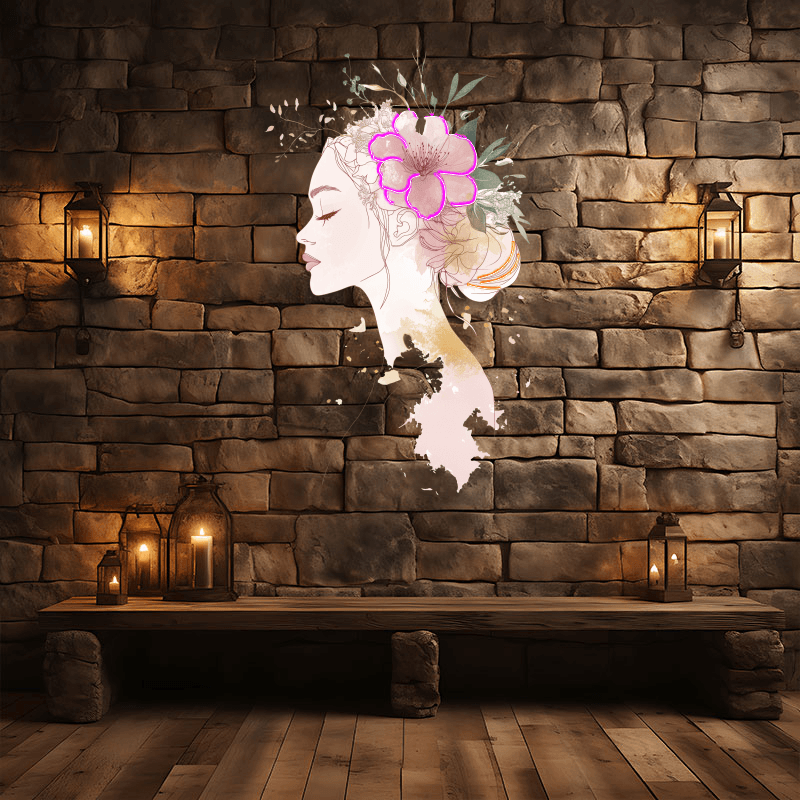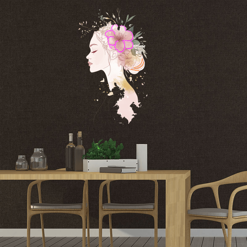 Fashion European and American Beauty Sketch Neon signs Lights - Side Face Head Portrait with Big Bouquet of Flowers on Head Decorative LED Lights, Personalized Home and Creative Space Lighting