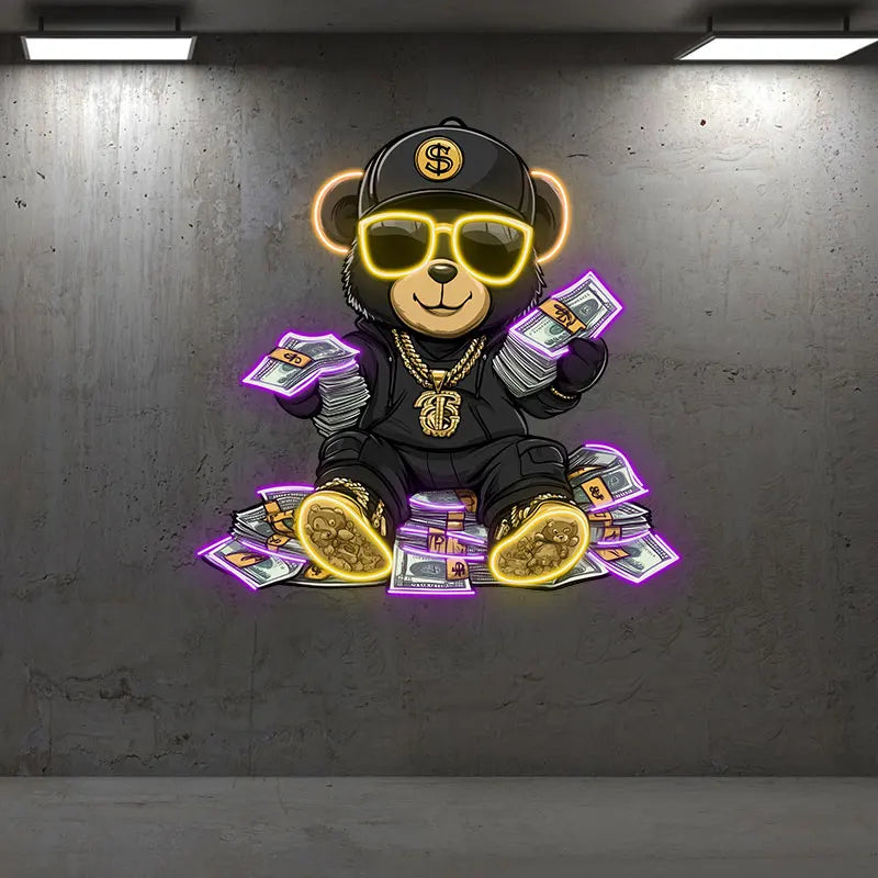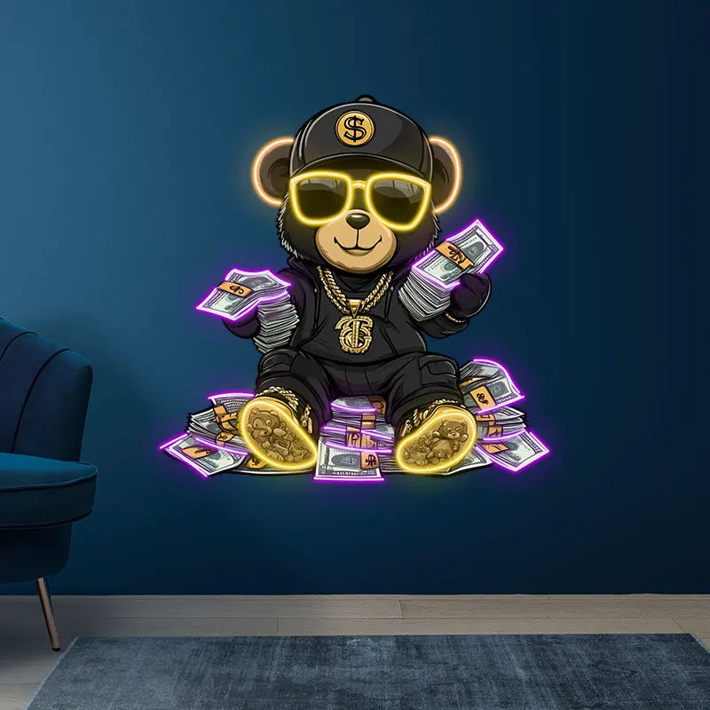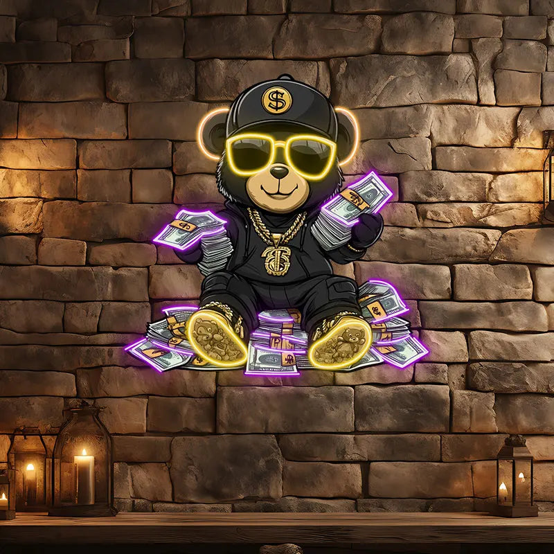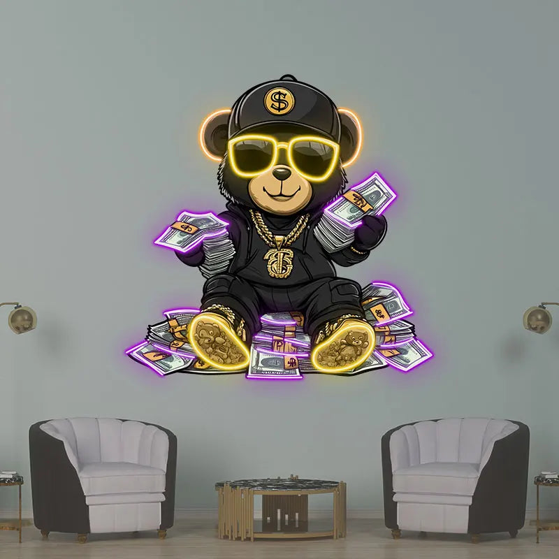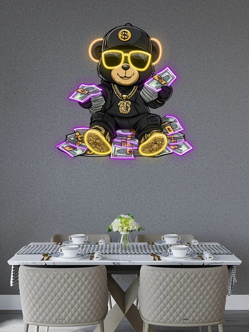 Rich Bear Sitting On The Pile Of Money Neon Sign, Creative Wall Hanging Neon Light, Whimsical Decor Light