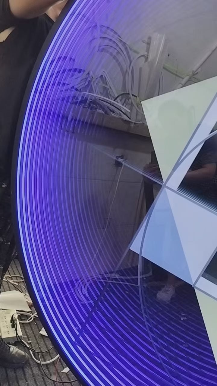 Round Infinity Mirror Wall Art – LED Blue Geometric Pattern Circle Design with Futuristic Optical Depth Effect for Modern Home, Gaming Room & Art Decor