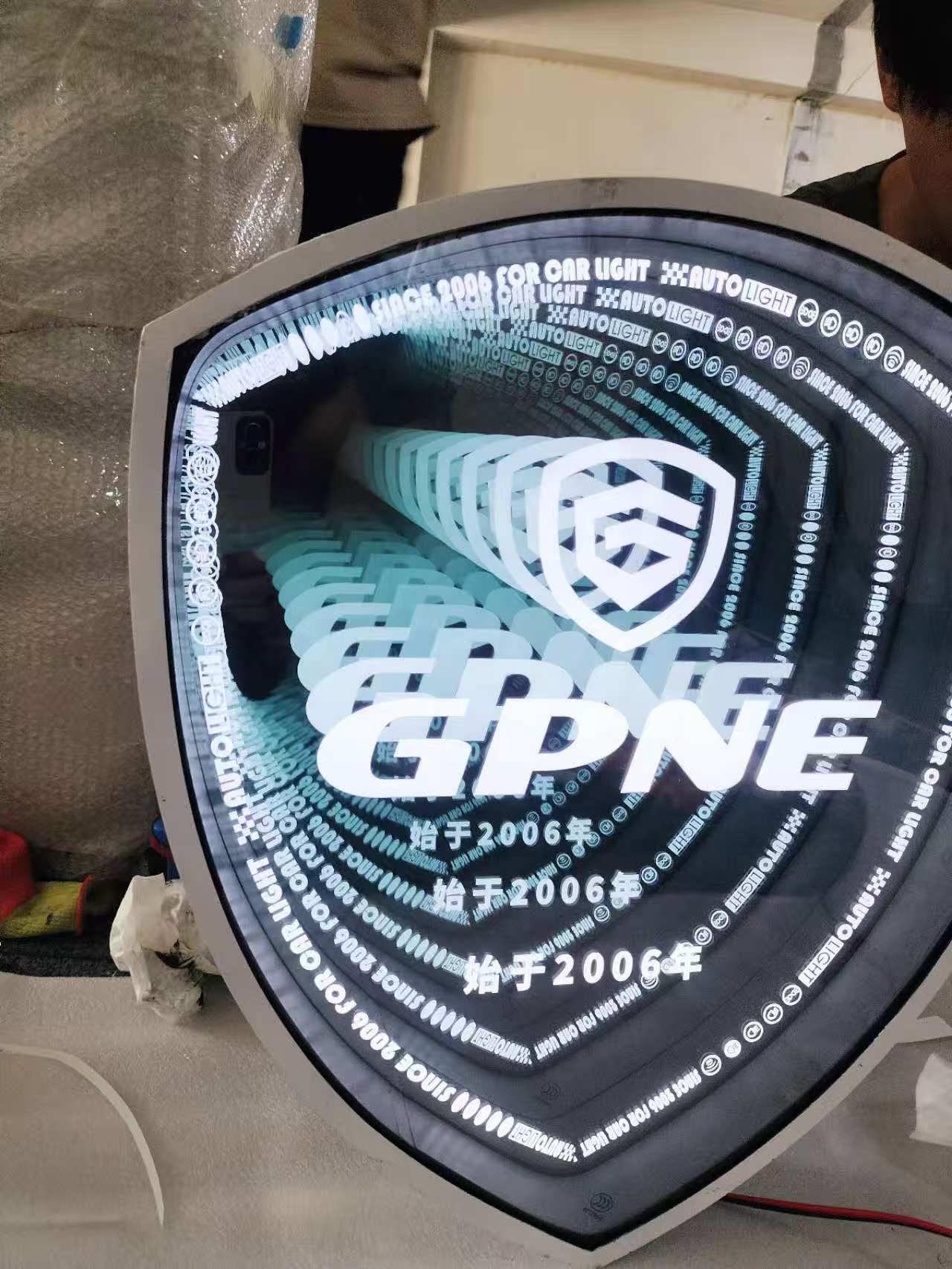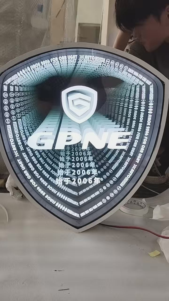 Shield Shape Infinity Mirror Wall Art – Blue Gray LED Illusion Light with White Text, 3D Futuristic Tunnel Decor for Home & Office