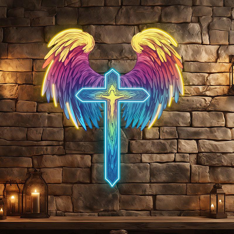 Spread Wings Cross Neon signs| Reddish Yellow Feather Decoration | LED Art Lighting